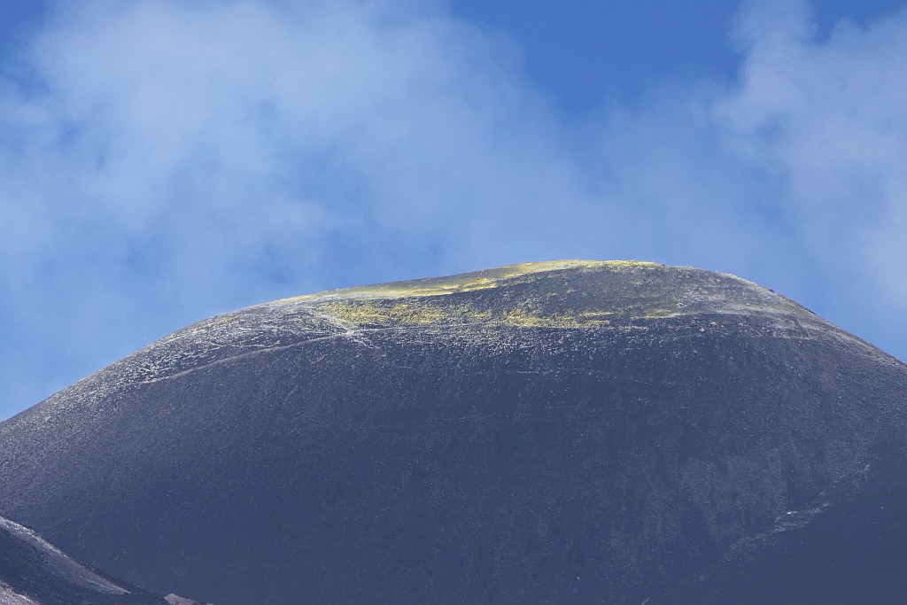 überzogen. Dazwischen befinden sich zahlreiche Fumarolen mit Schwefelablagerungen. Der neue Kegel geht im Westen direkt in den Zentralkraterkegel über bzw. hat diesen teilweise