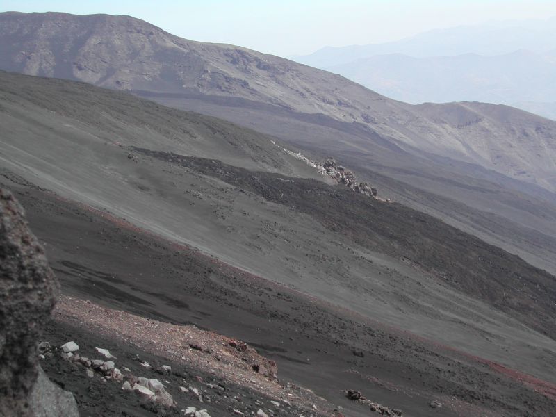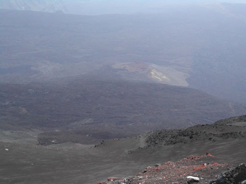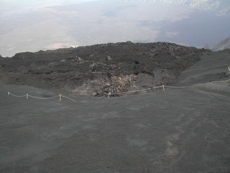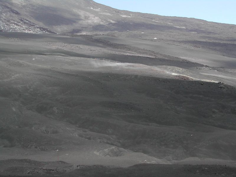 Blick von Süden (Nördlich Belvedere) aus auf die Spalten der 2004-2005 Eruption auf 2800 - 2900 m Höhe. Als langezogenen dunkleren Streifen kann man den Lavastrom vom 07.09.04 erkennen.