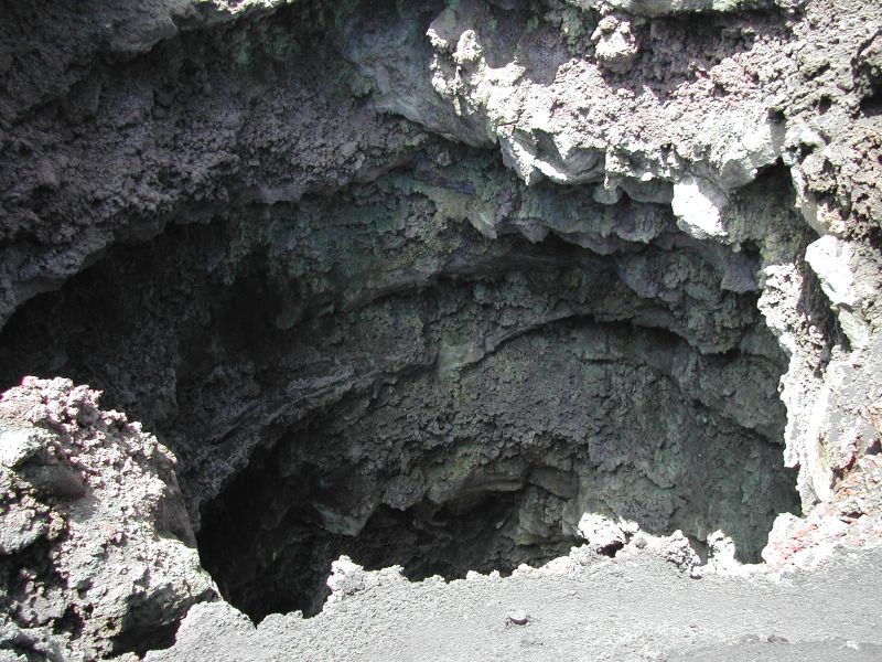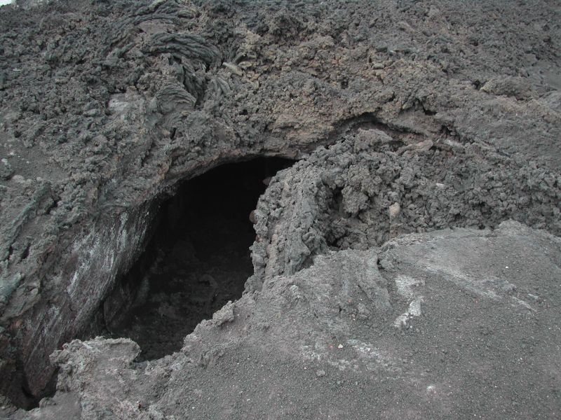 Unmittelbar hinter dem Schlot öffnet sich ein Lavatunnel (Blickrichtung ist Osten). Darüber lagert etwas Stricklava.