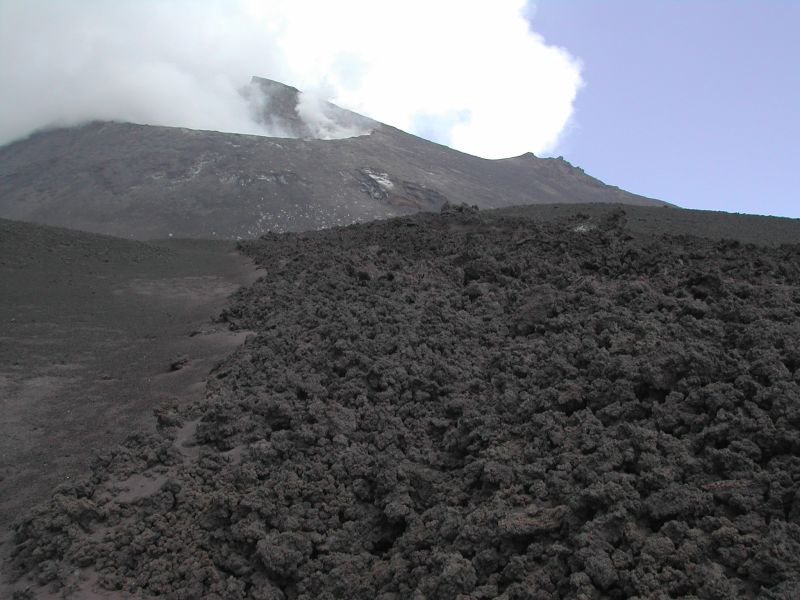 Blick von Osten aus auf den Lavastrom vom 07.09.04 auf ca. 2900 m Höhe. Im Hintergrund kann man den Südostkrater und den dampfenden Kollapsbereich dieses Kraters erkennen.
