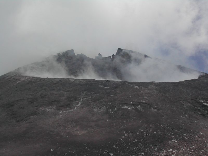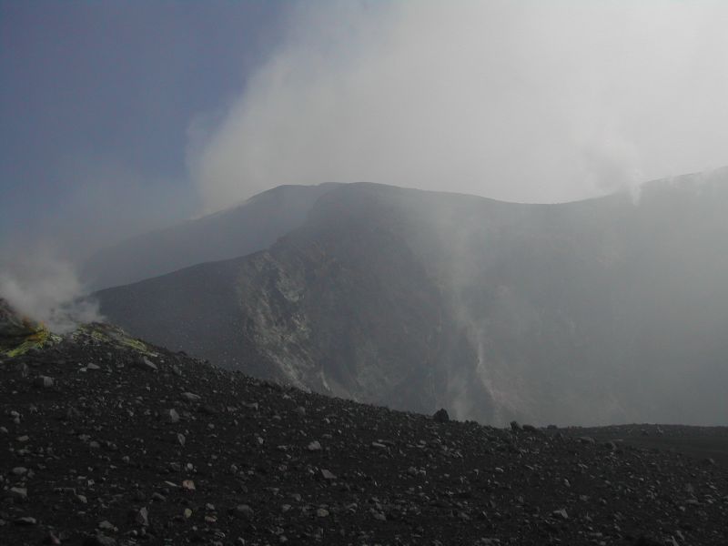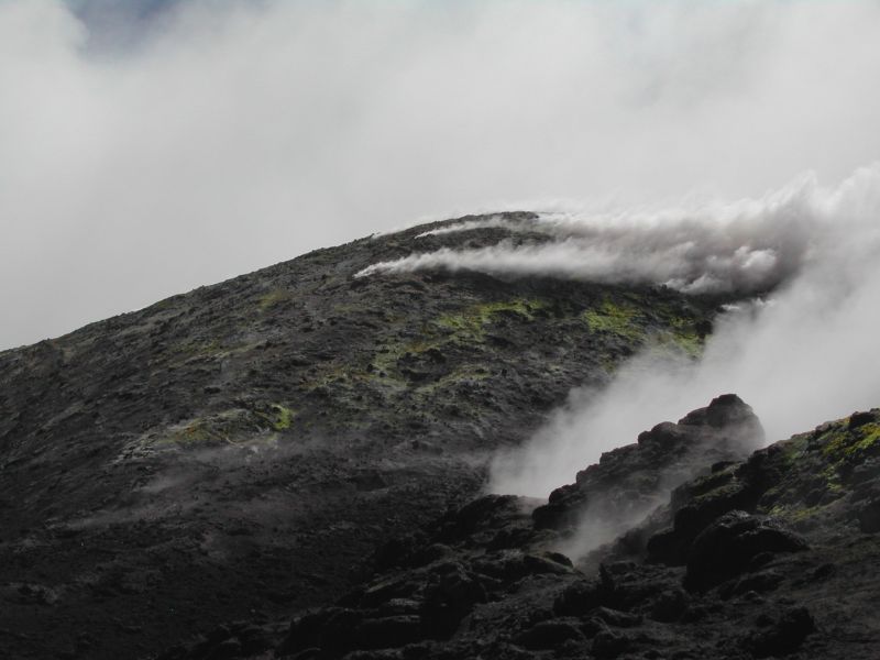 Von dem Nordostkrater steigt ständig eine kräftige Gas- und Dampfwolke auf. Der Wind drückt sie immer wieder herunter und macht einen Aufenthalt am Kraterrand unmöglich.