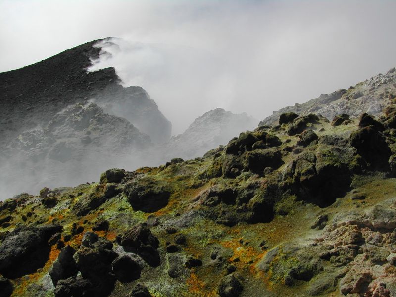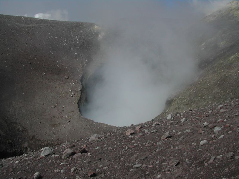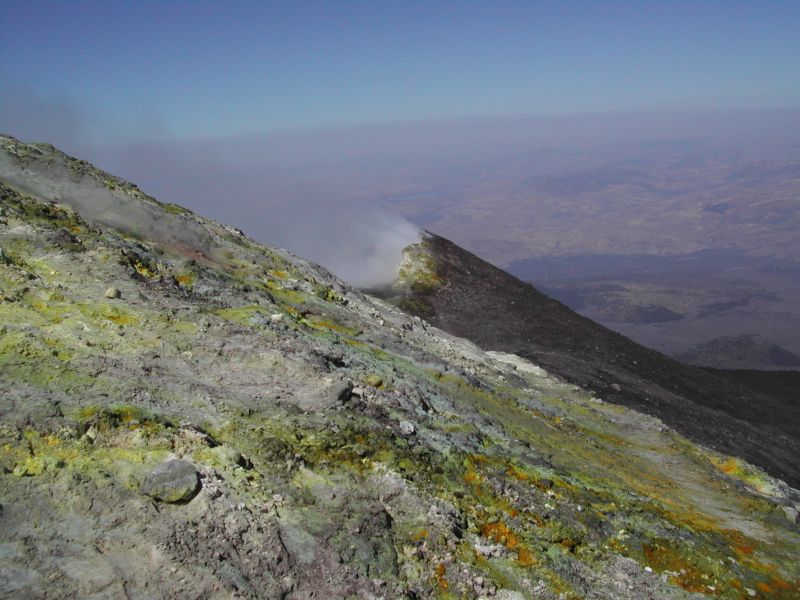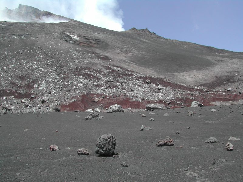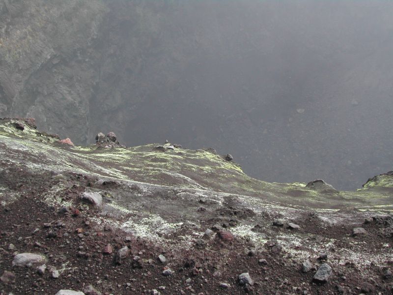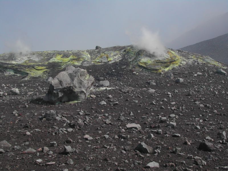 Im südwestlichen Bereich der Bocca Nuova sind einige Fumarolen aktiv. Kleine und große Blöcke sind über den Boden verstreut.