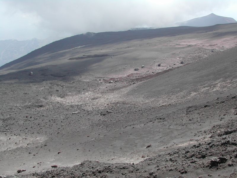 Blick von der Nordostflanke des Südostkraters (Levantino) aus in südliche Richtung. An der östlichen Basis des Südostkraters liegen große Blöcke. Links dahinter der Lavastrom vom 07.09.04.