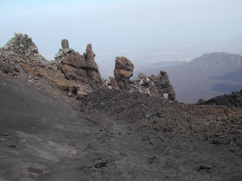 Blick dem Nordrand des 2004-2005 Lavastroms entlang auf die Serra Giannicola Piccola. Die bizarren Felsen haben die Lava ein wenig in südliche Richtung umgelenkt.