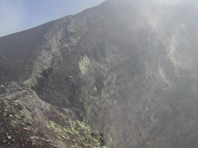 Am Kollapsbereich des Südostkraters, der sich während der 2004-2005 Eruption bildete, waren schwache Fumarolen aktiv. Abhängig von Luftfeuchte bzw. Temperatur machten sich diese mal mehr, mal weniger durch Dampfaustritt bemerkbar. Auch am Sudestino, dem südlichen Seitenkrater des Südostkraters, und entlang der 2001-Spalte bzw. des 2001-Hornitos, konnte ich in Abhängigkeit von den Wetterbedingungen Dampfaustritt beobachten. Die Flanke unterhalb des kollabierten Bereichs war recht instabil. Immer wieder lösten sich hier kleinere Blöcke und kullerten bis herunter an die östliche Basis des Südostkraters. Einige Meter nordöstlich des kollabierten Bereichs befindet sich ein weiterer kleiner Kollapskrater. Auch hier rutschte immer mal wieder Asche und Geröll nach. Am 29.06. konnte ich an der südöstlichen Basis die vorübergehende Öffnung eines kleinen Kollapskraters beobachten. Dieser öffnete sich völlig unvermittelt, wuchs innerhalb weniger Sekunden auf mehrere Meter Durchmesser an und hatte die Form eines Trichters. Er wurde von nachrutschendem Material jedoch sofort wieder verschlossen und praktisch eingeebnet. Dieser Kollaps könnte evtl. durch schmelzendes Eis verursacht worden sein, das sich in dieser Region unterhalb der Asche befindet.