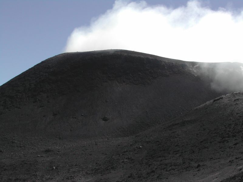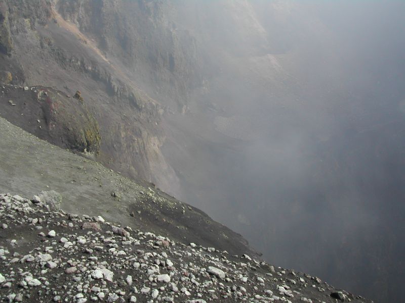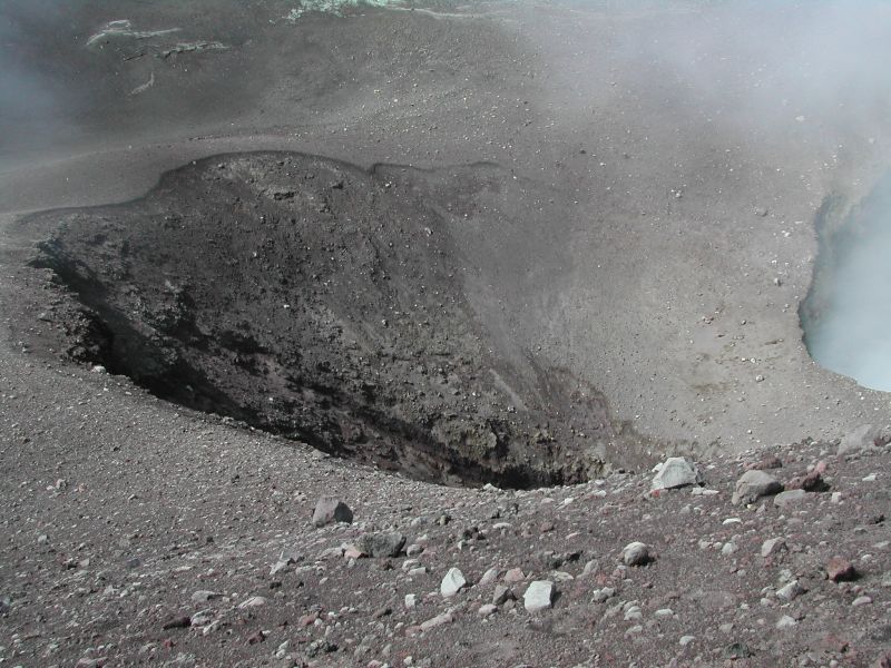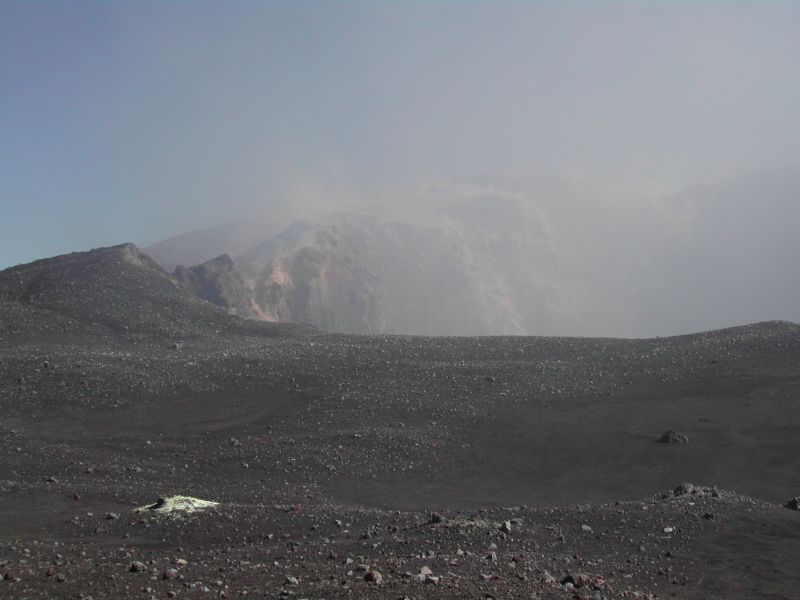 Am kleinen Kollapsschlot auf 2850 m Höhe, der sich im November 2004 bildete und ca. 110 m vom ersten Schlot der Eruption entfernt liegt. Blickrichtung ist West.