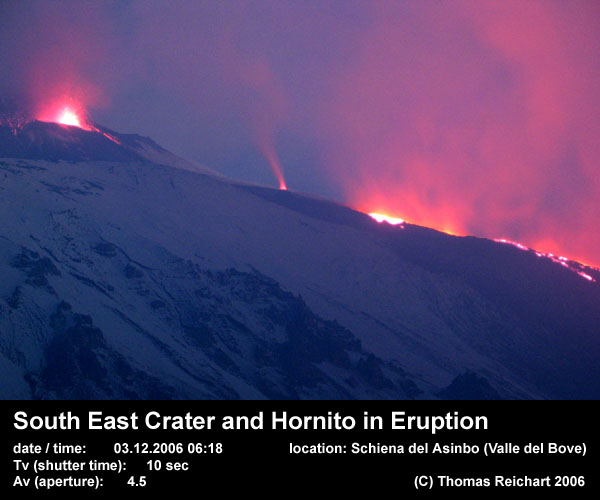 Betrachtet man den Ort des Schlackenwurfs, dann dürfte meiner Meinung nach wieder der Schlot an der Ostflanke des Südostkraters, der sich am 26.11.2006 geöffnet hatte, aktiv geworden sein. Gleichzeitig war ja dann auch wieder Glut im hohen "Valle del Bove" zu sehen, sodass man davon ausgehen kann, dass der Schlot auf 2800 m Höhe wieder seine effusive Tätigkeit aufnahm. Wie ich ja bereits in meinem Update vom 03.12.2006 vermutete, stehen beide Öffnungen höchstwahrscheinlich in Verbindung, wobei der Schlot an der Ostflanke des Südostkraters überwiegend zur Gasfreisetzung dient.