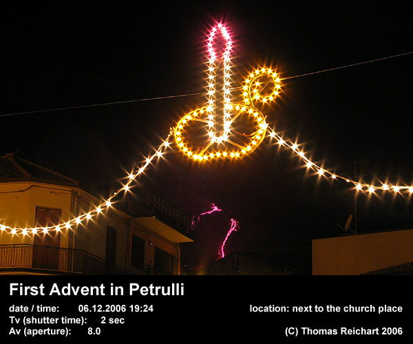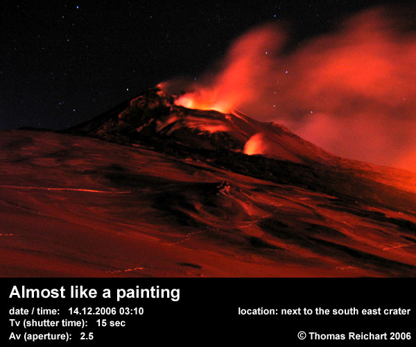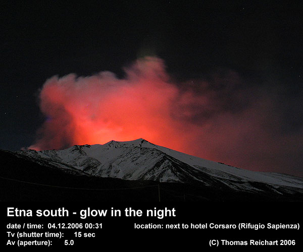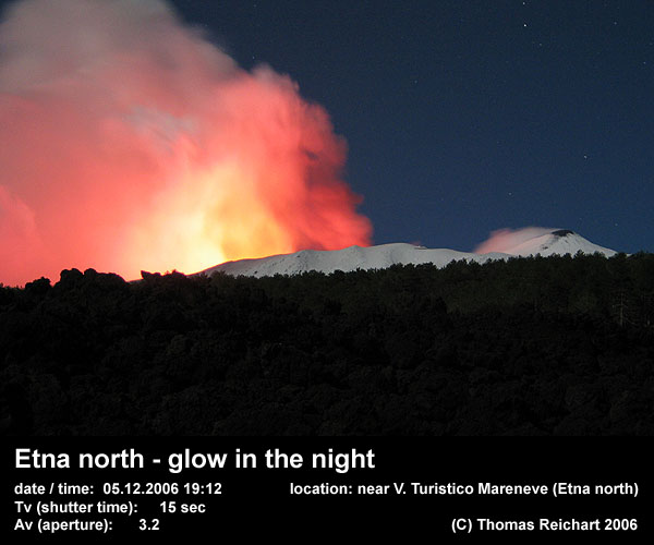 Während am Kirchplatz in Petrulli (Ostflanke) vorweihnachtliche Stimmung herrscht, produziert der Berg weiter seine eigene Adventsbeleuchtung: Zwei rotglühende Lavaströme aus dem Schlot auf 2800 m Höhe sind im hohen "Valle del Bove" unterwegs.