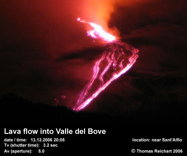 Dieses Foto vom Abend des 30.11.2006 zeigt die Lavaströme im oberen "Valle del Bove". Links oben der Südostkrater, rechts davon kann man den Schlackenwurf am Hornito auf 2800 m Höhe erkennen. Mehrere kleine Teilströme fließen unterhalb des Hornitos dem steilen Hang hinab. Der längere nördliche Strom zieht sich durch das ganze Bild: