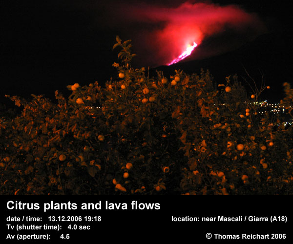 Blick von der Gegend bei Mascali (Ostflanke) über einen Zitronenstrauch hinweg nach West/Südwest. Seit zwei Tagen ist der Ätna wieder aktiv und inzwischen bewegt sich ein kräftiger Lavastrom im unbewohnten Tal "Valle del Bove".
