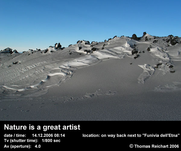Inzwischen ist der Ätna fest im Griff des Winters. Am Rand der 2002-Lava, gegenüber der Seilbahnstation, hat der Wind den Schnee zu einem bizarren Kunstwerk modelliert.