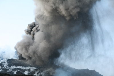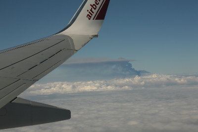 Dieses Foto aus dem Flugzeug zeigt die ca. 4000 m hohe Aschewolke aus dem Südostkrater. Sie wird vom Wind in Richtung Süd/Südwest getragen.