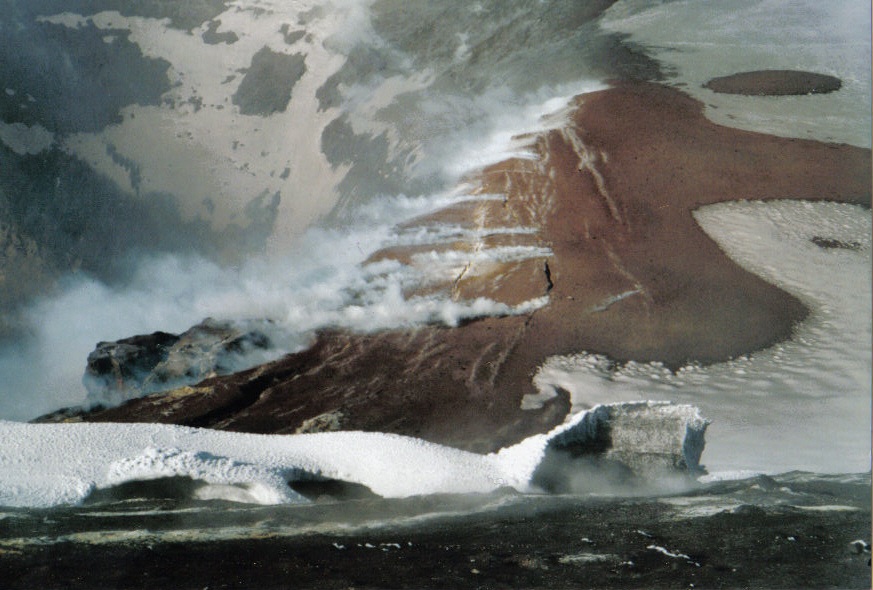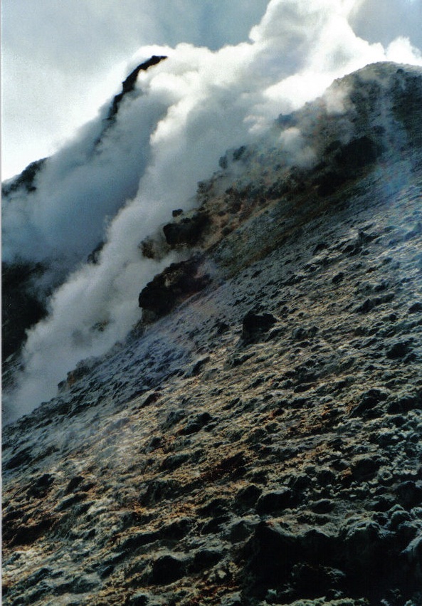 Am Nord/Nordost-Rand des Kraters setzen Fumarolen große Mengen Dampf frei. Der Wind drückt die weißen Wolken in den Krater. Der Boden ist hier überall mit Schwefel überzogen. Man kann einen Graben erkennen, der in westliche Richtung verläuft. Offenbar steht er mit den Spalten am Zentralkraterkegel in Zusammenhang.
