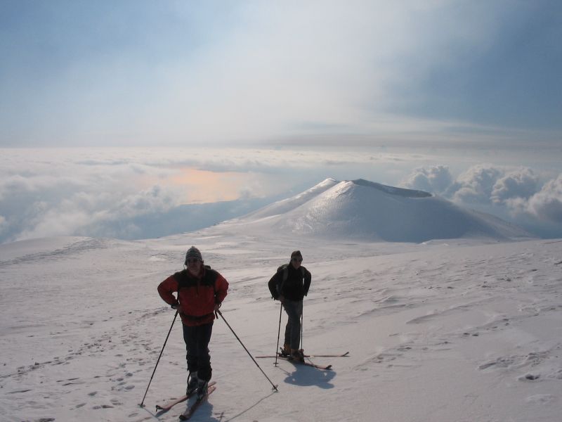 Blick über das Piano del Lago hinweg nach Süden auf den Kegel von 2001 und den Montagnola. Der Gipfelbereich des Ätna ist wegen Schneehöhen von bis zu einem Meter, zur Zeit am besten per Ski zu erreichen.