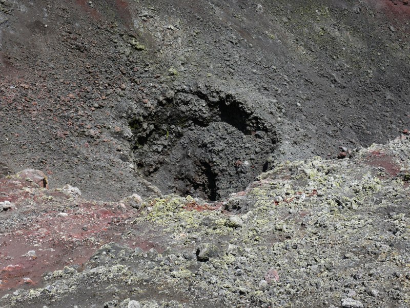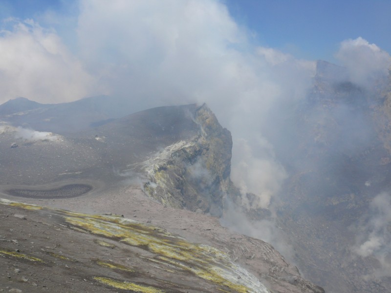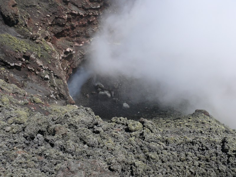 Aus dem nordwestlichen Schlot der Bocca Nuova trat leider soviel Gas und Dampf aus, dass es mir nicht möglich war hinein zu schauen. An dem westlichen Rand des Schlots konnte ich jedoch keine Veränderungen gegenüber dem Vorjahr feststellen. Wie schon im letzten Jahr war im begehbaren westlichen Teil der Bocca Nuova die Aktivität der Fumarolen eher schwach ausgeprägt.