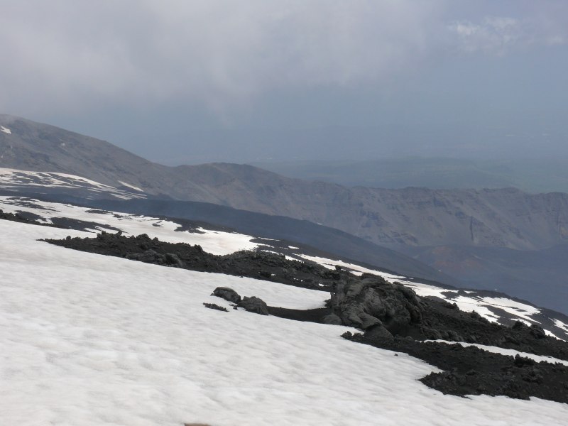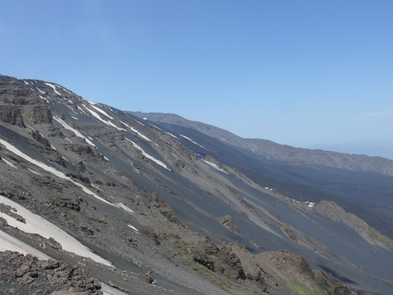 Blick von der Mareneve-Straße aus nach Westen auf die Ostflanke des Ätna. Links oben der Südostkrater. Rechts unterhalb davon die eruptive Spalte. An den Schloten auf ca. 2800 m Höhe kommt es zu anhaltender Gasfreisetzung. Unterhalb davon das große fächerförmige Lavafeld.