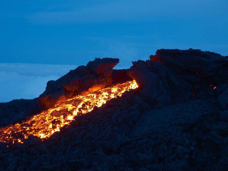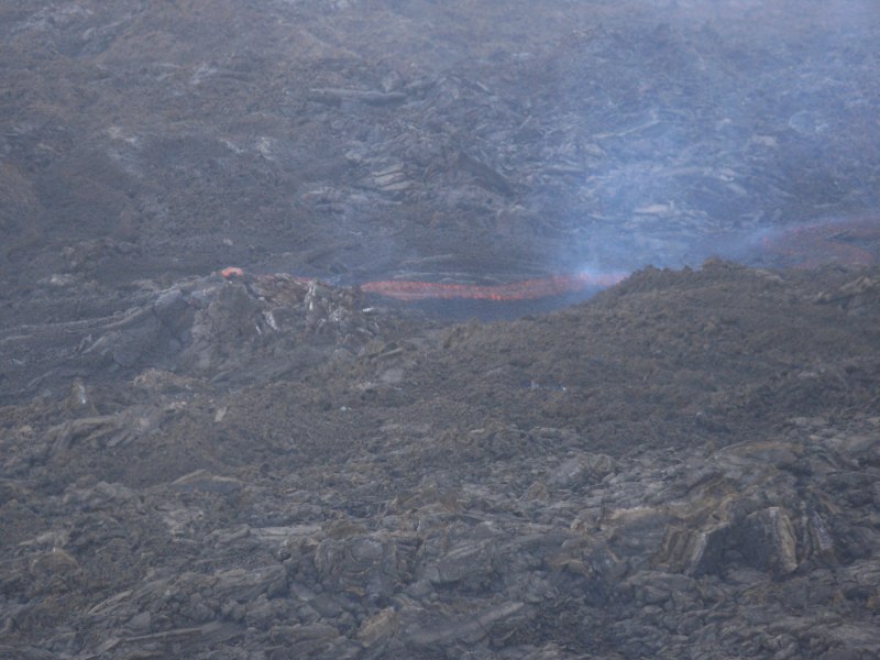 Im Lavafeld unterhalb der eruptiven Spalte. Lavaemission am Tummulus auf ca. 2500 m Höhe.