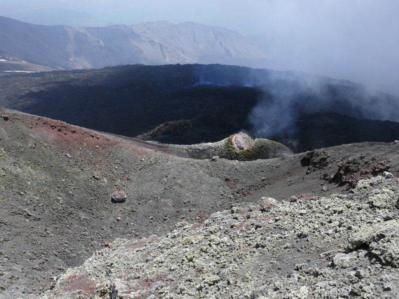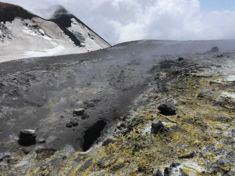 Blick auf einen Graben am südöstlichen Rand der Voragine. Im Graben gibt es einige tiefe Löcher und an einigen Stellen steigt Dampf auf. Im Hintergrund der Südostkrater.