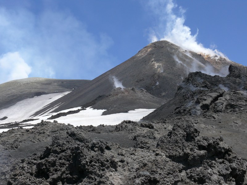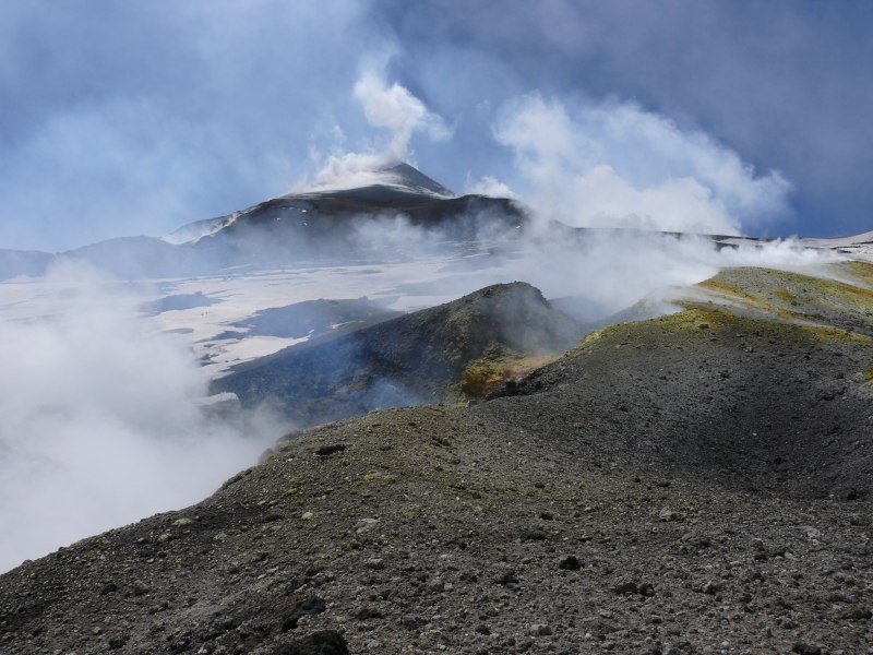 Ein weiteres traumhaftes Foto von der oberen Ostflanke des Ätna. Rechts die nach Nordosten fließenden Lavaströme. In der Bildmitte die Spalte mit Gasemission aus den drei Schloten auf 2800 m Höhe. Links darüber der Südostkrater; Fumarolen an seinem Gipfel setzen eine lange Gasfahne frei. Auch aus dem Kollapskrater unterhalb davon entweicht Dampf bzw. Gas. Rechts der Nordostkrater.