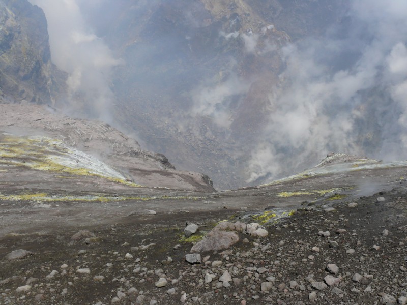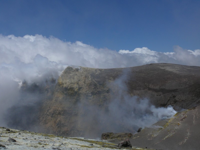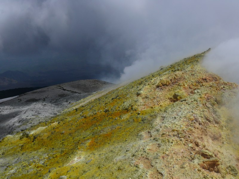 Heute habe ich die Gipfelkrater besucht. Leider beeinträchtigten Wolken, starke Gasfreisetzung und stürmischer Wind die