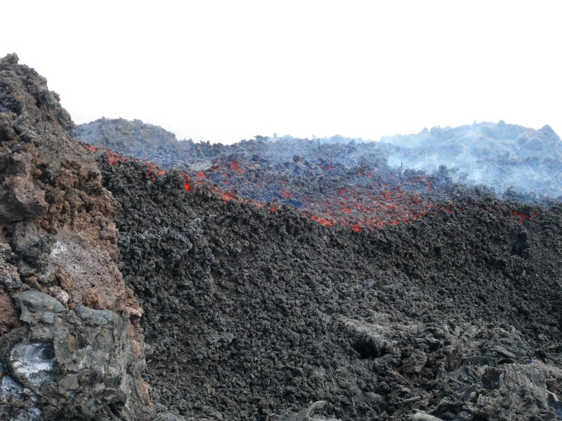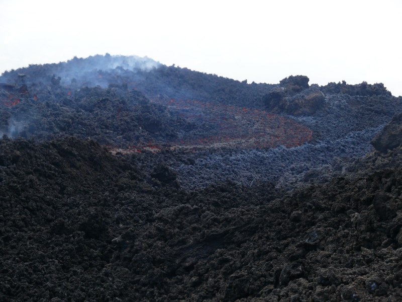 Immer wieder ändern sich Position und Intensität der sekundären Ströme innerhalb des Lavafelds. Wie schon in den letzten Tagen und Wochen schlägt die Lava eine nordöstliche Richtung ein, kommt jedoch kaum voran und unterschreitet selten 2300 m hohes Gelände.