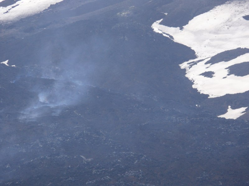 Auf der Serra delle Concazze. Der Blick geht in südwestliche Richtung auf den oberen Abschnitt des Lavafelds. In der Bildmitte der Bereich in der sich der temporäre Schlot befindet. Er speist drei Lavaströme. Nur der Strom der sich in nordöstliche Richtung bewegt ist gut zu erkennen. Er wird durch die aufsteigenden Gasfahnen markiert. Rechts oberhalb davon ein kleinerer Strom der nach Norden fließt.
