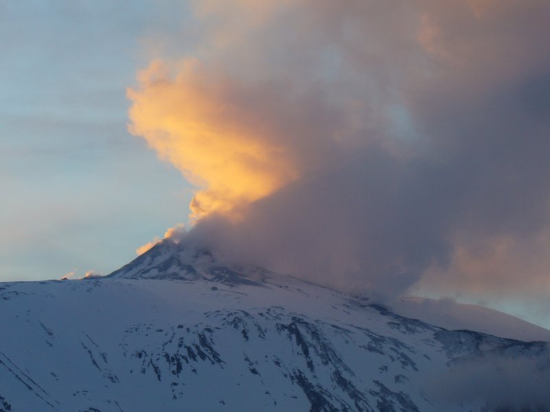 Blick auf den Südostkrater bei Sonnenuntergang. Die tiefstehende Sonne taucht die Gasschwaden aus den Gipfelkratern in ein malerisches Licht. Rechts unterhalb davon die eruptive Spalte mit weißen Dampfsäulen aus den Schloten auf 2800 m.