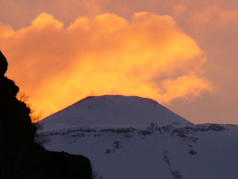 Die Abendsonne lässt die Wolken über dem Laghetto glühen. Der Kegel im ehemaligen Piano del Lago entstand während einer heftigen Eruption im Sommer 2001.