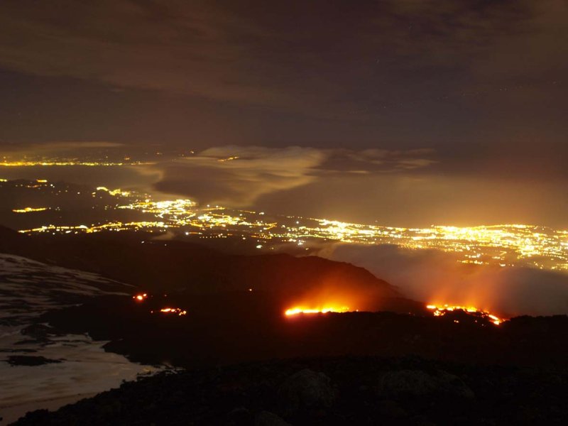 Blick von der eruptiven Spalte aus in nordöstliche Richtung auf die Lavaströme die sich in das Valle del Bove ergießen. Im Hintergrund die Lichter der Städte an der Ostküste, darunter Giarre und Taormina.