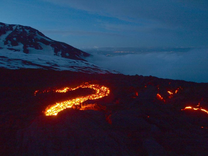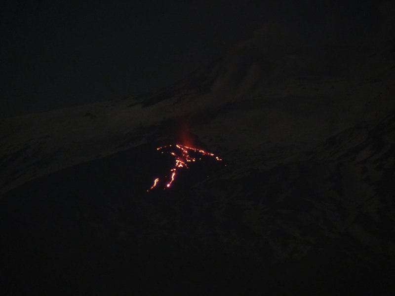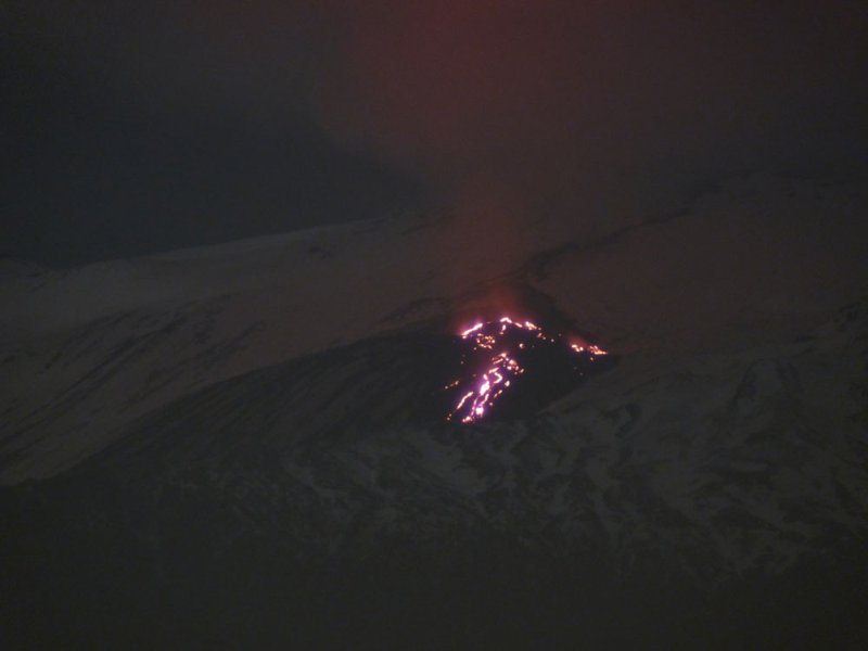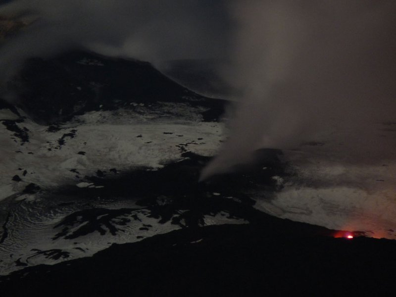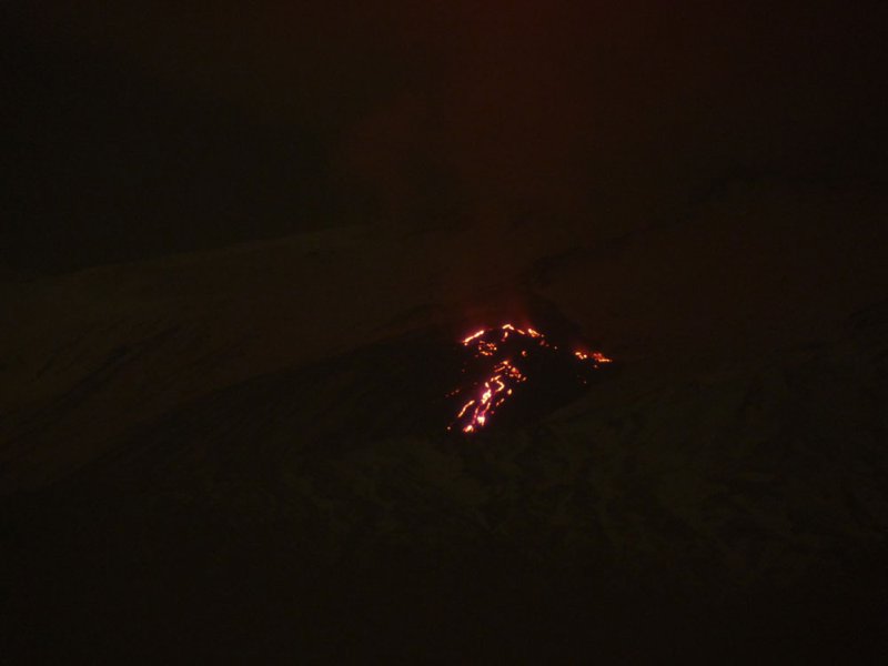 Der aufsteigende Dampf und die Gase der Eruption bilden eine große Wolke die von den Lavaströmen rötlich angeleuchtet wird. Rechts dahinter kann man die eruptive Spalte erkennen, die sich als dunkler Streifen dem Hang hinauf zieht. Dampfsäulen markieren die Position der Schlote auf ca. 2800 m Höhe.