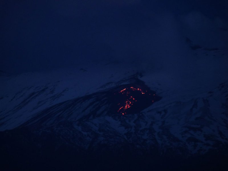 Blick auf die steile westliche Wand des Valle del Bove. Bei einbrechender Dunkelheit hebt sich das dunkle Lavafeld der seit 11 Monaten andauernden Eruption nur noch schwach von den hellen Schneeflächen ab. Im nordöstlichen Bereich leuchten die aktiven Lavaströme die sich nach unten hin in zahlreiche Teilströme und Zungen verzweigen.