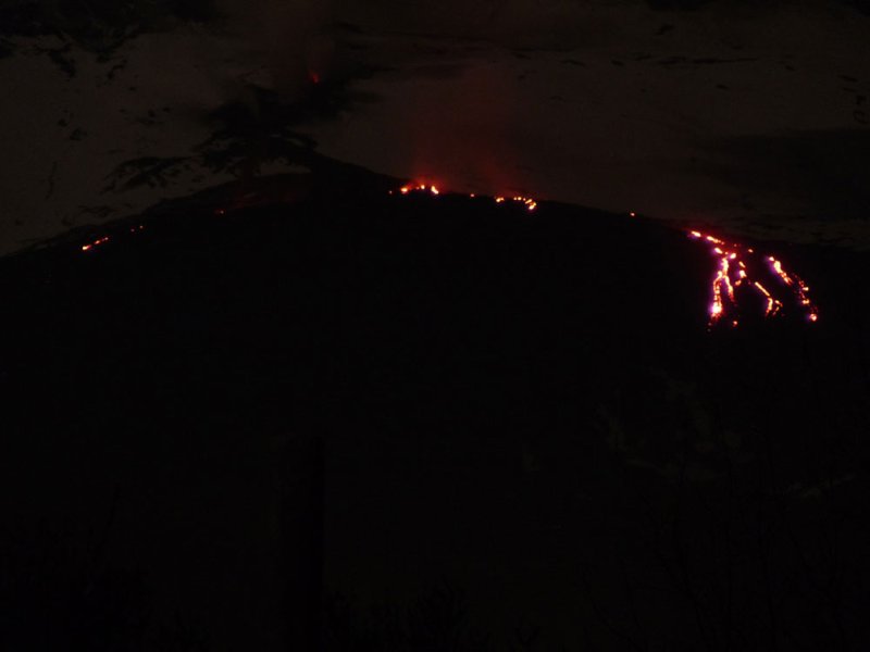 Dieses eindrucksvolle Foto zeigt den oberen Teil des Lavafelds und die eruptive Spalte bei längerer Belichtungszeit. Schön ist die Dampfemission aus den Schloten erkennbar. Man beachte die Ablagerung von schwarzer Asche auf dem Schnee links von der Spalte. Oben der Südostkrater, mit dem neuen Krater des Paroxysmus vom 10.05.2008 und dem Levantino von 2001.