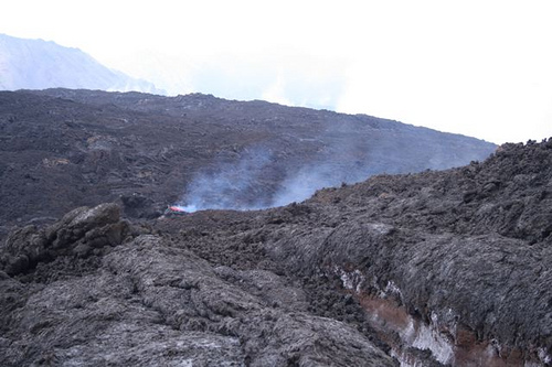 Blick hinunter auf das Lavafeld mit dem einzigen noch aktiven temporären Schlot. Der obere temporäre Schlot, der in der Vorwoche noch Lava gefördert hatte (siehe Update vom 30.06.2009), ist dagegen verschlossen und inaktiv.