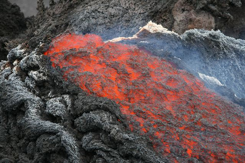 Der obere temporäre Schlot befindet sich auf ca. 2650 m Höhe und setzt langsam Lava frei.