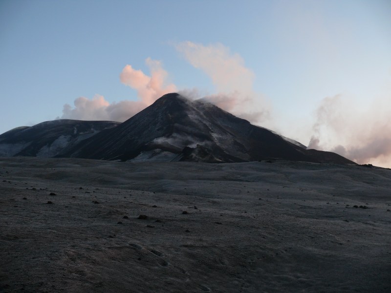 Blick über die mit Reif überzogenen Aschefelder auf den Südostkrater. An diesem sehr kalten Juli-Morgen dampfen alle Stellen des Kraters die nur geringfügig wärmer als die Umgebung sind.