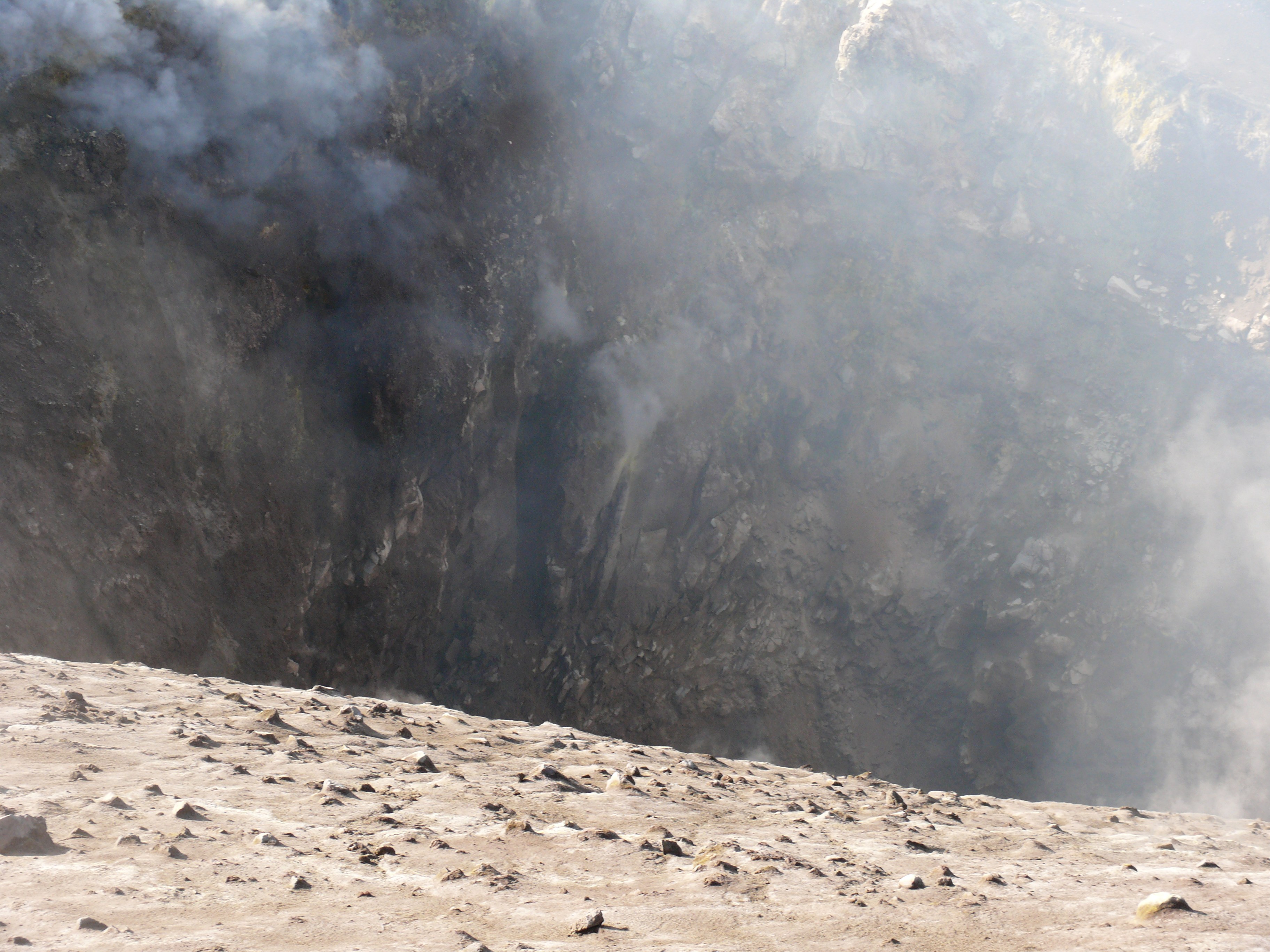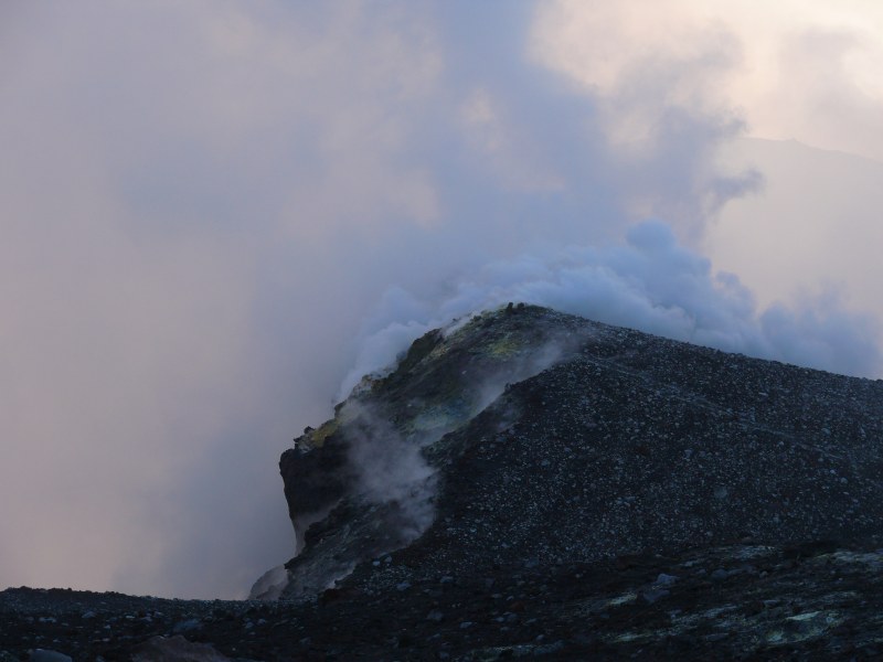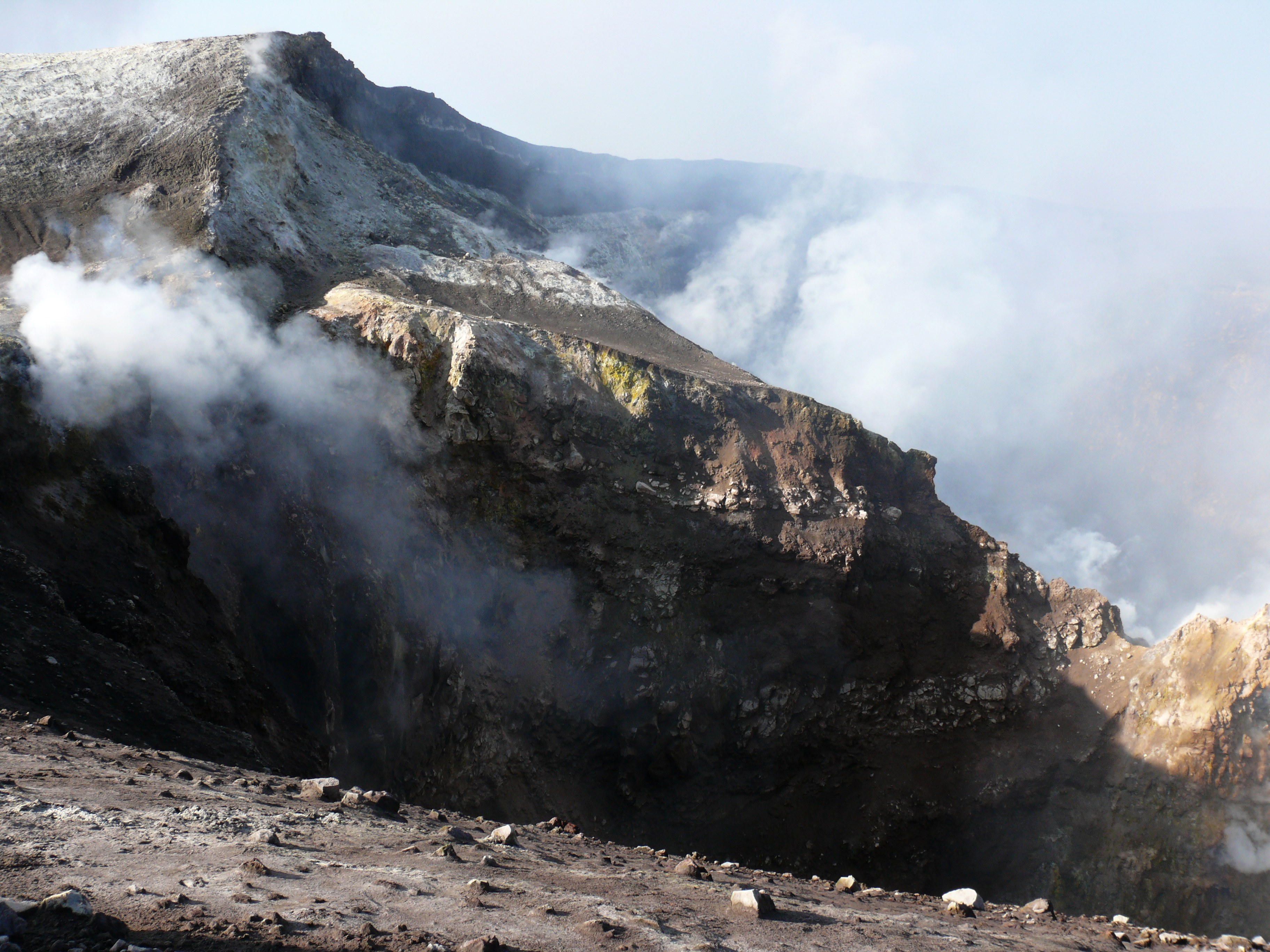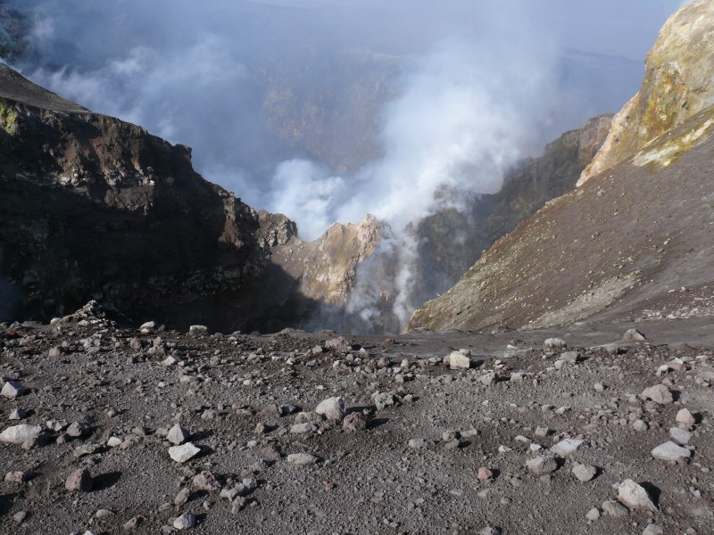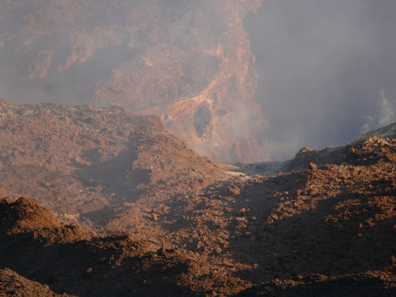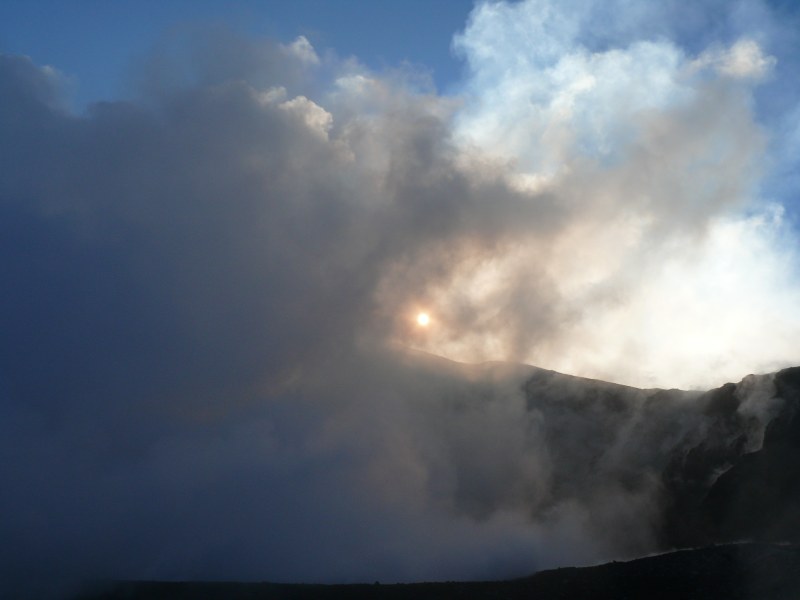 Wegen starker Gasfreisetzung in Verbindung mit erhöhter Luftfeuchtigkeit war es kaum möglich in die beiden Schlote der Bocca Nuova hineinzuschauen. Nur ein