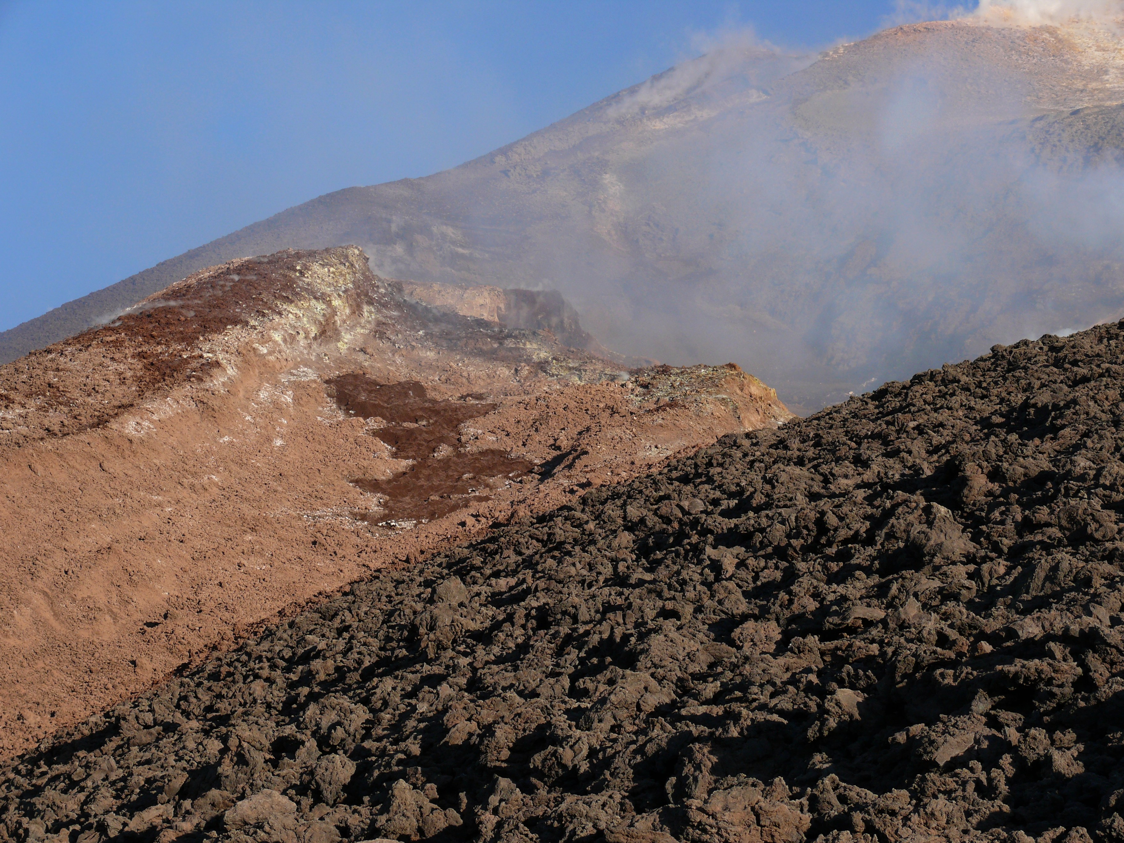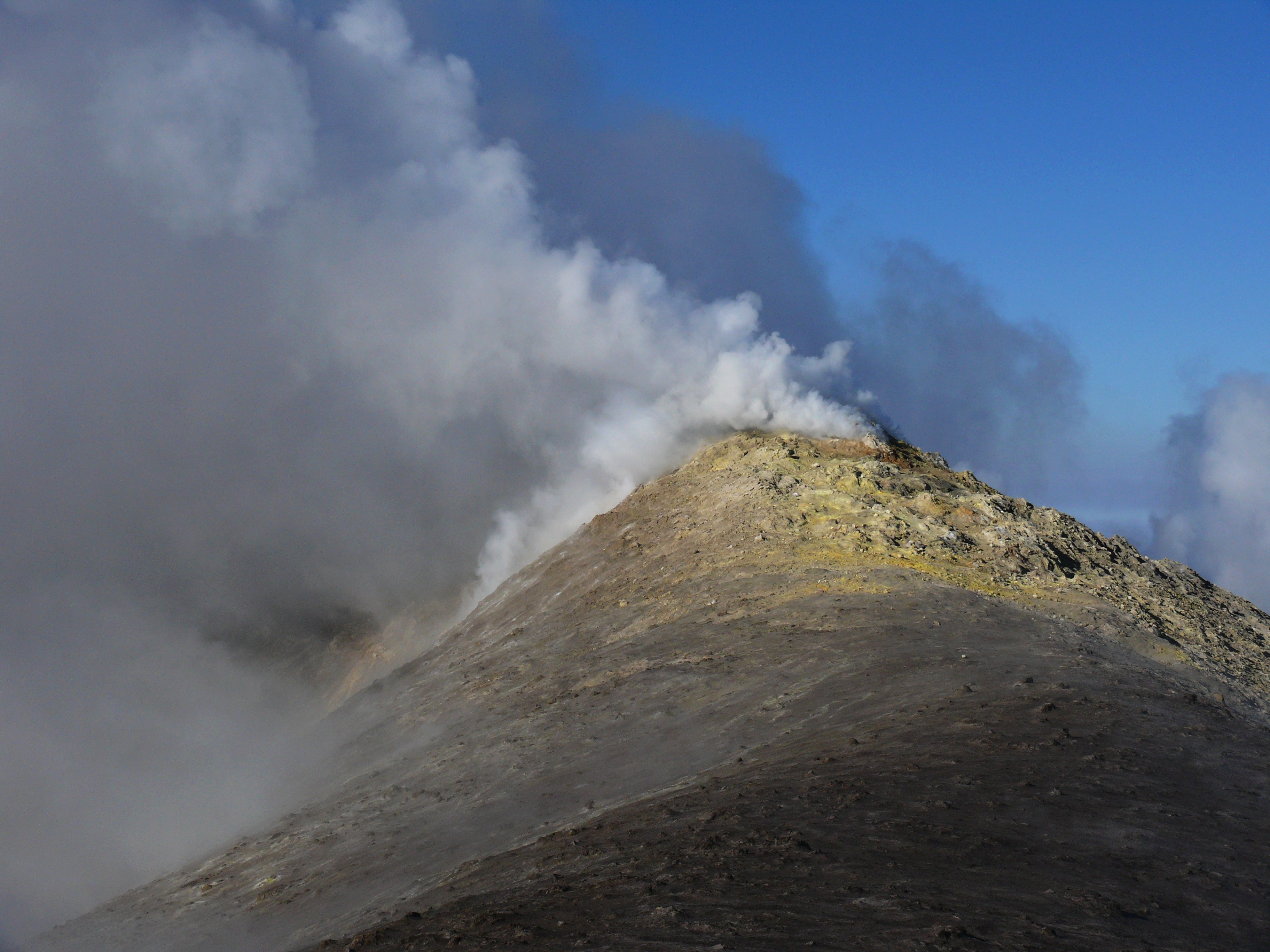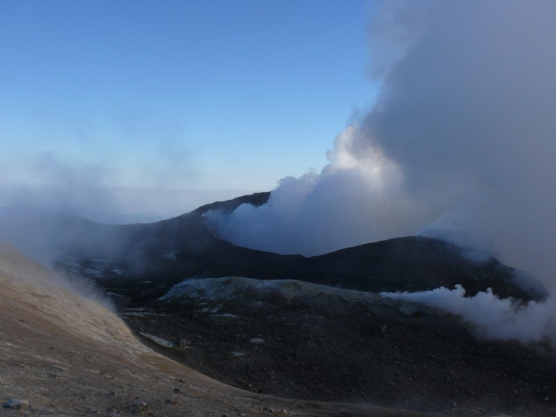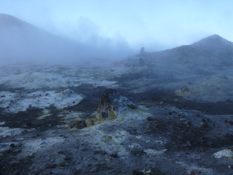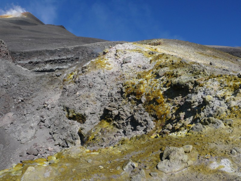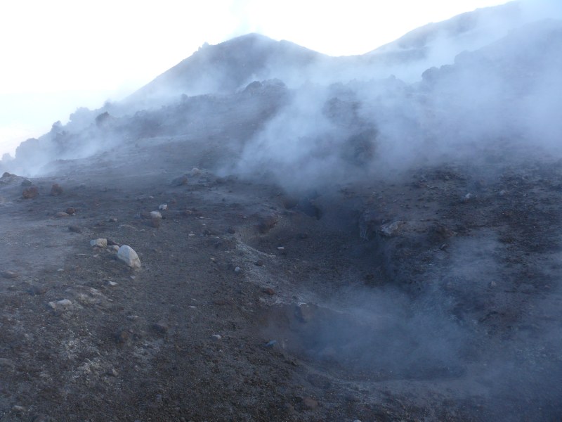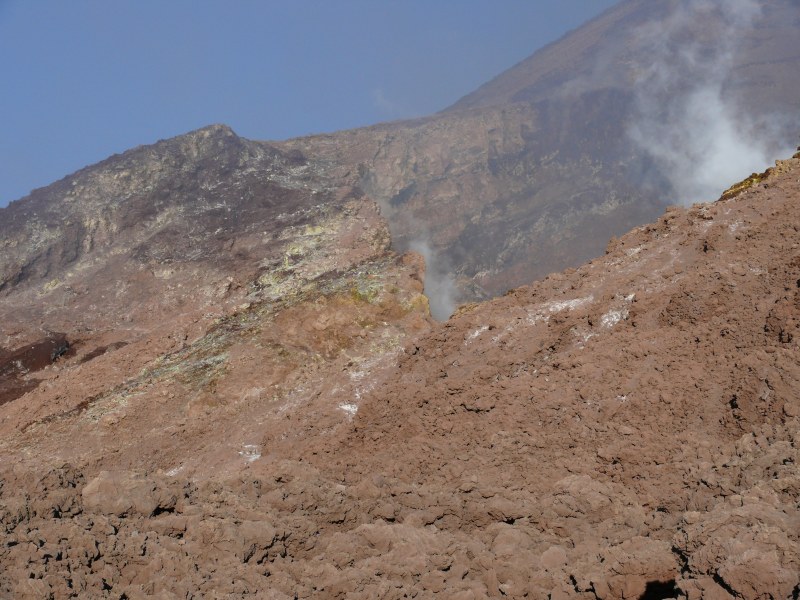 oberen Ostflanke haben sich die Fumarolen verstärkt. Dieser Bereich wird nun zunehmend von gelben Schwefelablagerungen geprägt. Von