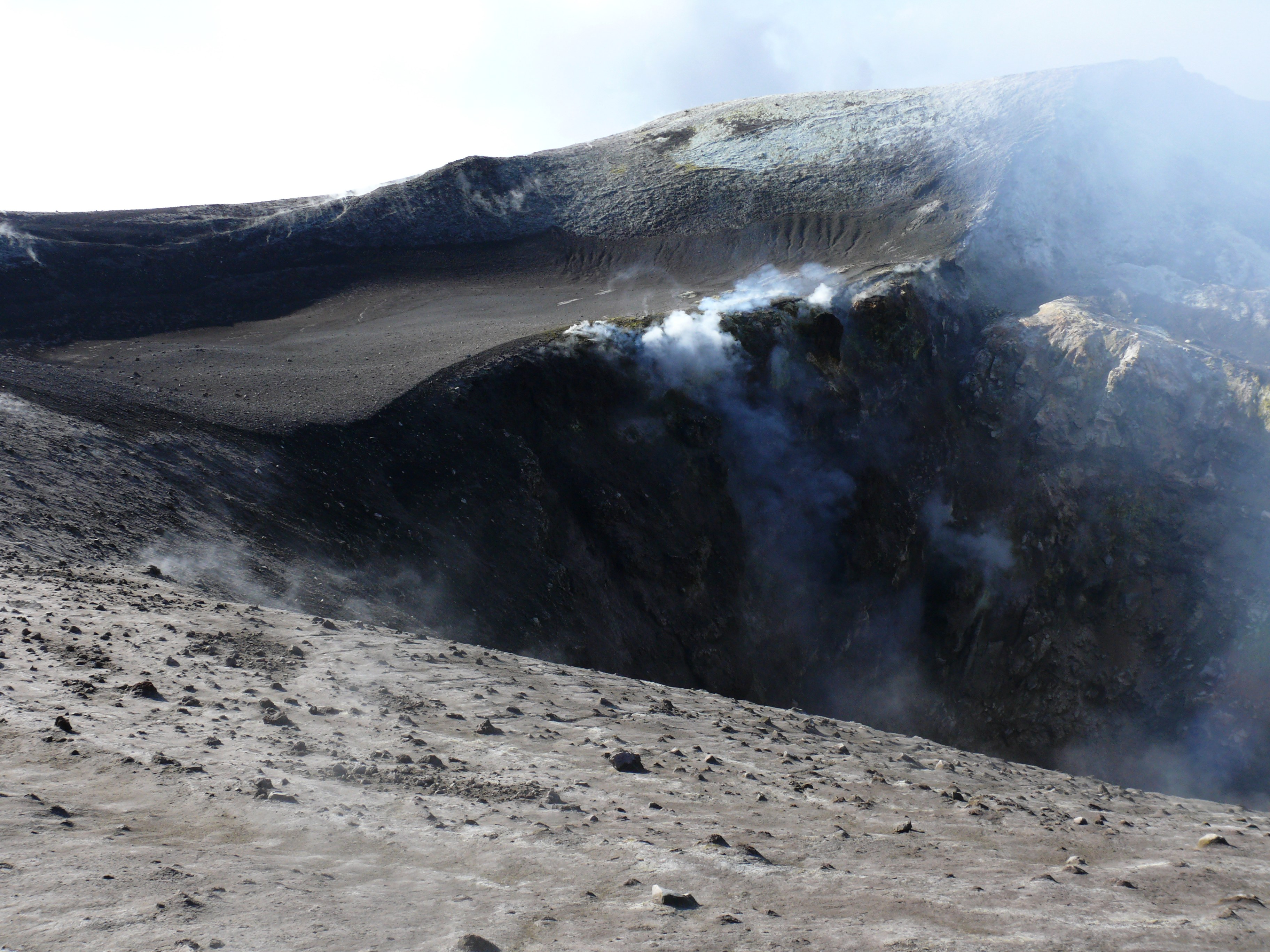 glühende Öffnung begann und sich durch Kollaps inzwischen zu einem großen Krater erweitert hat, aufgefressen.Wegen der hohen Luftfeuchte und dadurch schlechten Sichtbedingungen, sowie sich wieder rasch verschlechternden Wetterverhältnisse war ein Besuch des Nordostkraters heute leider nicht möglich. Von der Voragine aus konnte ich keine Veränderungen bemerken. Ein vom nordöstlichen Rand der Voragine kommender Graben zieht sich bis hinauf zum Schlot. An einigen Stellen dieses Grabens wird Dampf freigesetzt. Auch am südlichen Rand des Nordostkraters gibt es einige heiße Stellen die heute kräftig dampften. Der Nordostkrater selbst stetzte mäßig und pulsartig Gas frei. Alle 10 - 15 Minuten war ein tiefes rumpeln aus dem Krater zu hören.