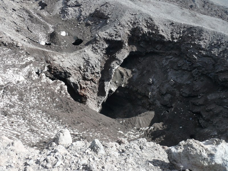 Hier noch ein Foto vom Schlot des Nordostkraters vom 12.07.2010, das mir Frau B. Weyer freundlicherweise zur Verfügung gestellt hat. Dank schwacher Gasfreisetzung war an diesem Tag ein Blick tief hinein in den Schlot möglich. Wie sie berichtet war auch immer mal wieder ein tiefes Grummeln, allerdings ohne Freisetzung von Material, hörbar: