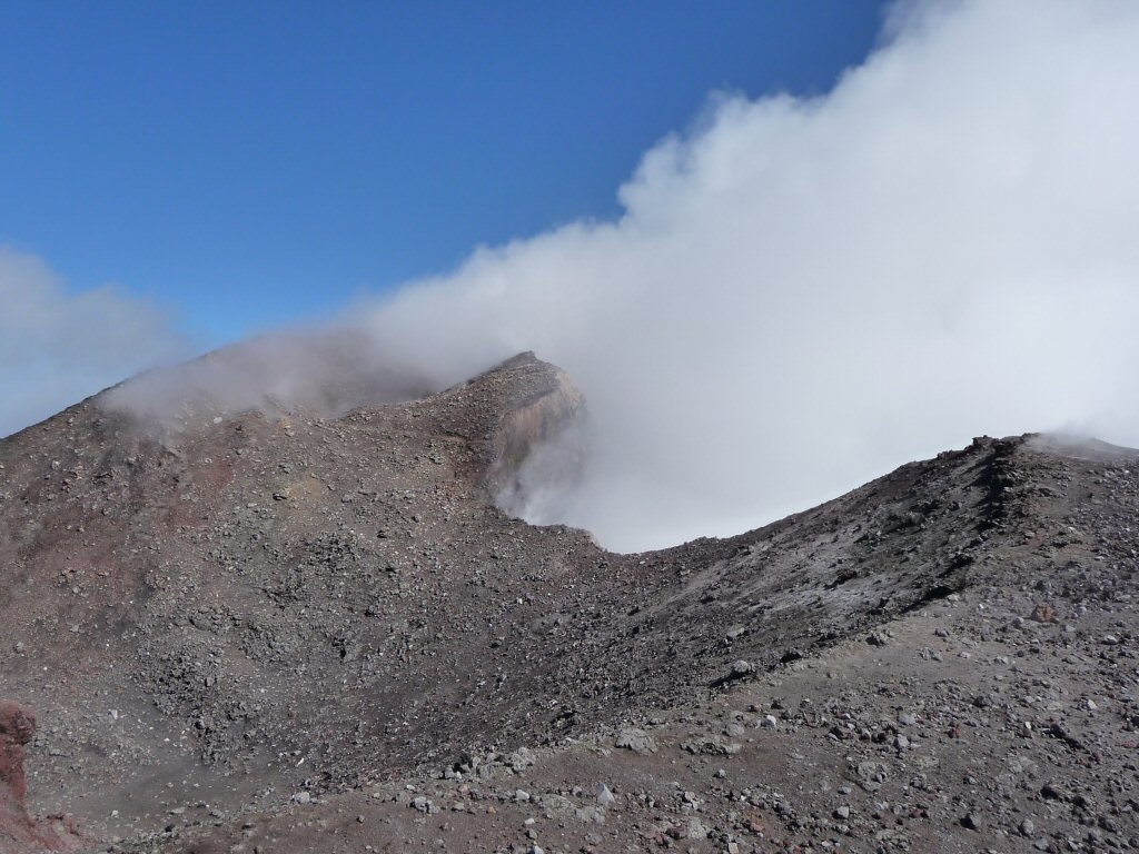 Dieses Foto vom 02.10.2010, das mir freundlicherweise Herr T. Furter zur Verfügung gestellt hat, zeigt die morphologischen Veränderungen an dem nordwestlichen Schlot der Bocca Nuova infolge der explosiven Aschefreisetzungen vom August. Vom ehemaligen westlichen Kraterrand ist nur noch eine Felsnase übriggeblieben die in den Schlot hinein ragt. Etwas unterhalb der Nase kann man noch ein Stück des Pfades erkennen, der um den Schlot herum führte. Große Teile davon sind weggebrochen: