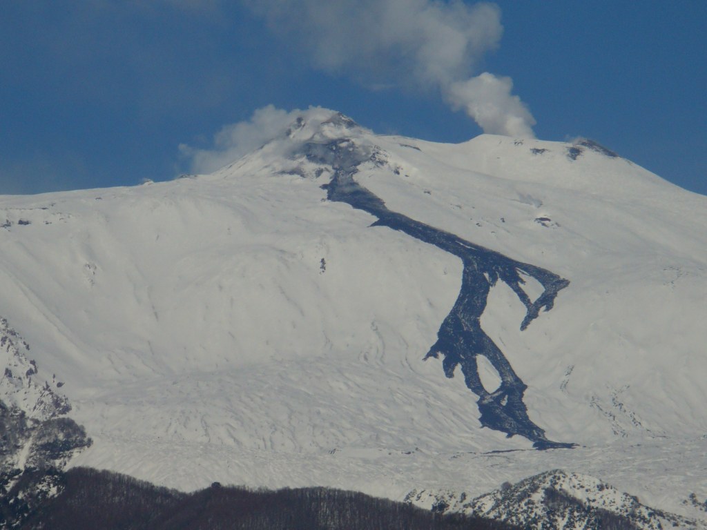 Wolken verhinderten in der vergangenen Woche häufig die Beobachtung der Gipfelkrater mittels Webcams. In den wolkenfreien Stunden zeigte sich am Nordostkrater starke pulsartige Gasemission. Am nordwestlichen Schlot der Bocca Nuova wirkten die Gasemissionen weiterhin etwas schwächer als am Nordostkrater. Am Südostkrater konzentrierten sich die Gasemissionen auf die Fumarolen im Gipfelbereich. Der Kollapskrater an seiner Ostflanke setzte weiterhin kaum Gas frei. Auch am gestrigen Abend zeigten die Webcams dort keine Auffälligkeiten bzw. thermische Anomalien. Gegen 05:00 Uhr war auf der Montagnola-Webcam sporadisch diffuse Glut im Bereich des Kollapskraters erkennbar. Dichte Wolken, die während der Nacht aufgezogen waren, verhinderten leider die direkte Beobachtung der Aktivität. Das schlechte Wetter hielt sich bis in die Mittagsstunden. Dann war über die Wärmebildkamera auf dem Montagnola heftige eruptive Aktivität erkennbar, die intensive thermische Anomalien verursachte. Gleichzeitig wurde auch die Sicht von der Ostflanke aus besser und von Milo konnte man einen frischen Lavastrom an der westlichen Wand des Valle del Bove erkennen, der sich als breite schwarze Zunge durch den weißen Schnee zog. Bald verdichteten sich die Wolken wieder und machten eine weitere Beobachtung unmöglich.