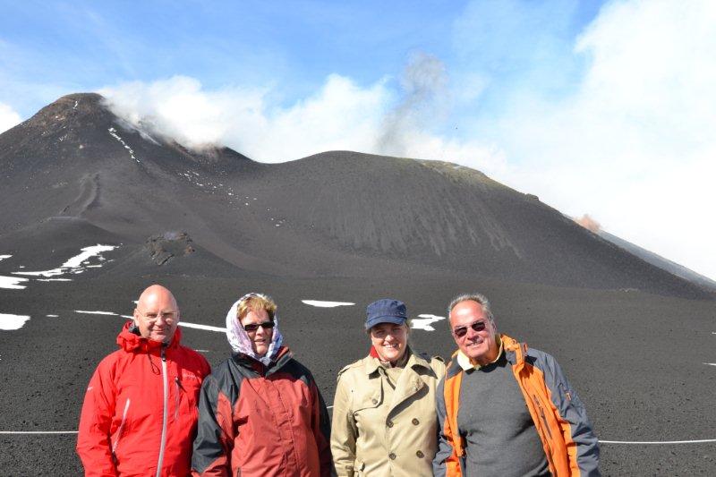 Während Touristen am Torre del Filosofo vor dem Südostkrater posieren, baut sich der Paroxysmus allmählich weiter auf. Rechts an der südöstlichen Flanke des Neuen Südostkraters kann man erste Staubwolken erkennen. Sie markieren den beginnenden Austritt von Lava aus dem Krater. Ganz links der alte Südostkrater der lediglich Gas aus Fumarolen freisetzt.