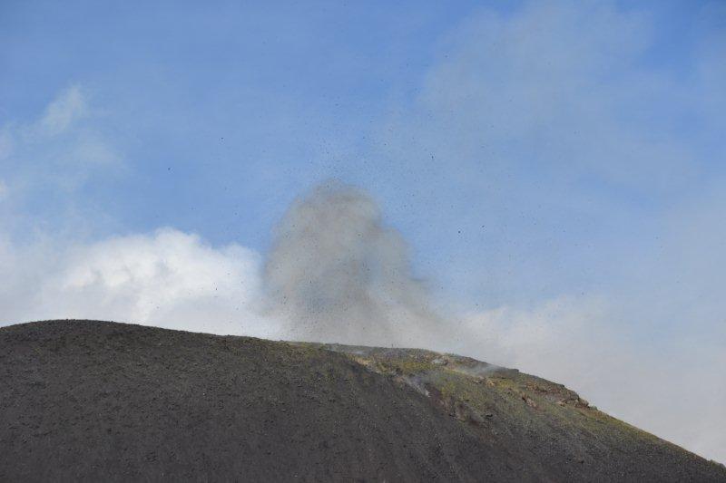 Blick vom Torre del Filosofo aus nach Norden auf den Neuen Südostkrater. Seit über zwei Stunden kommt es hier zu strombolianischen Explosionen die nun immer stärker werden. Ein kräftiger westlicher Wind treibt die Gas- und Aschewolken in östliche Richtung.