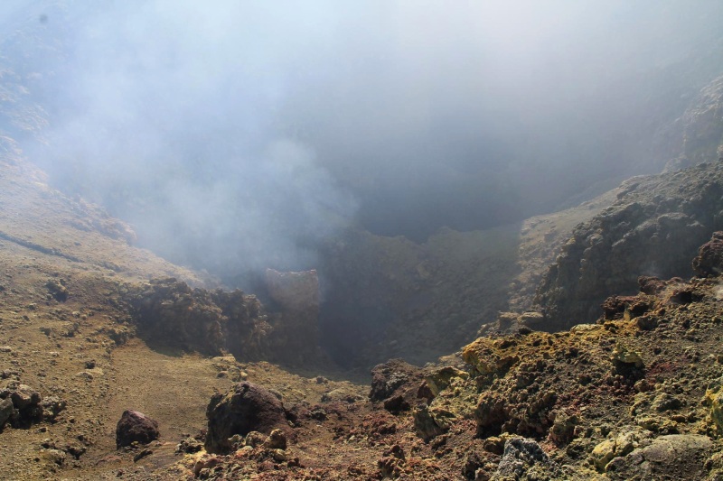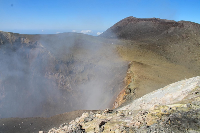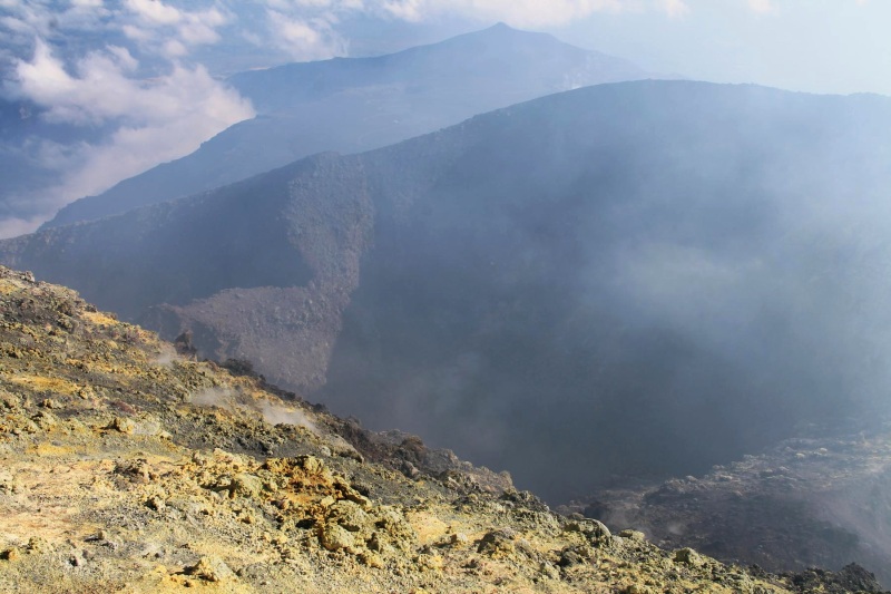 Blick vom südlichen Kraterrand des Neuen Südostkraters auf den Schlot von Krater Nr. 5. Er befindet sich unterhalb des Sattels, der ihn von Krater Nr. 4 trennt. Der Schlot ist offen, setzt aber kaum Gas frei.