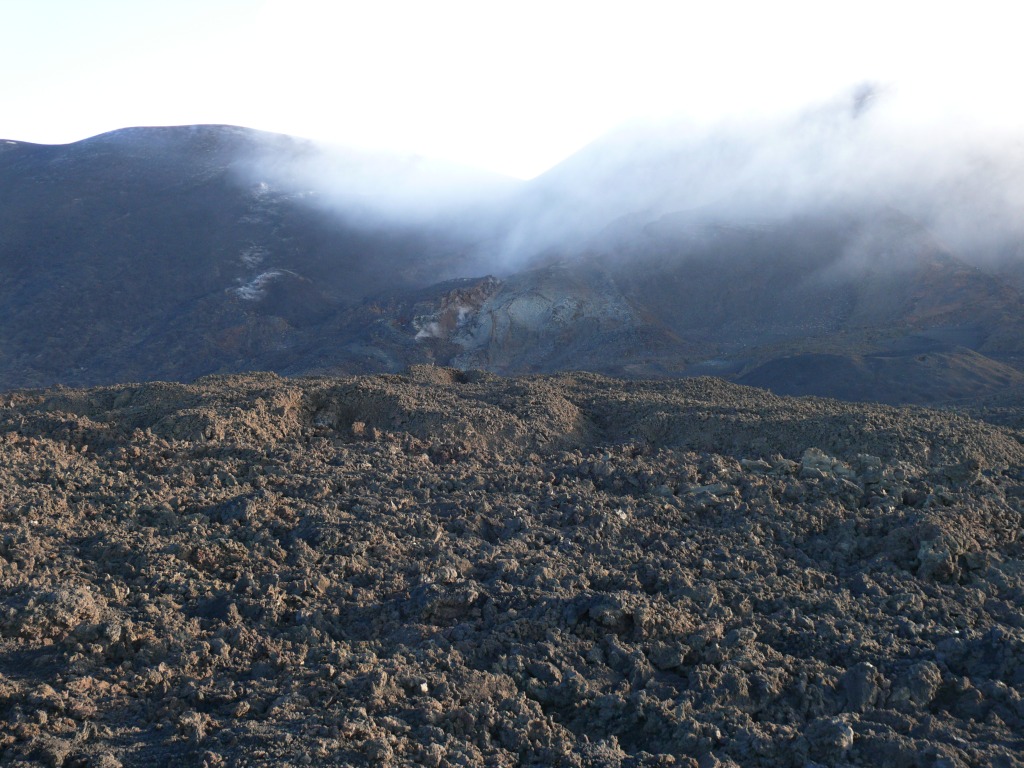 Leider konnte ich die Nord- bzw. Nordostflanke des Neuen Südostkraters auf Grund der Wetterbedingungen nicht einsehen. Allerdings war es mir möglich hinab in das Valle del Bove auf das Lavafeld zu blicken, das von der jüngsten eruptiven Episode des Neuen Südostkraters zwischen dem 13.05. und 16.05.2015 generiert wurde. Es umzirkelte den Kegel des Monte Simone und ergoss sich dann bis knapp vor den alten Felsen des Rocca Musarra, wo es auf ca. 1700 m hohem Gelände zum Stillstand kam.