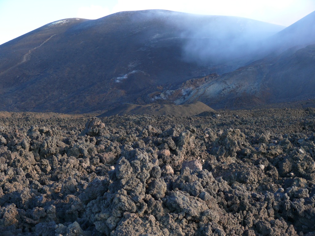 Die südliche Basis des Neuen Südostkraters wurde insbesondere durch die Aktivität des Jahres 2013 deutlich erhöht. Mehrere Lavaströme wälzten sich von dort aus nach Osten und teilweise auch nach Süd-/Südwest. Dabei erreichten sie auch die untere Flanke der 2002-Kegel (linke Bildhälfte). In der oberen Bildmitte kann man den Zentralkraterkegel im Hintergrund erkennen.