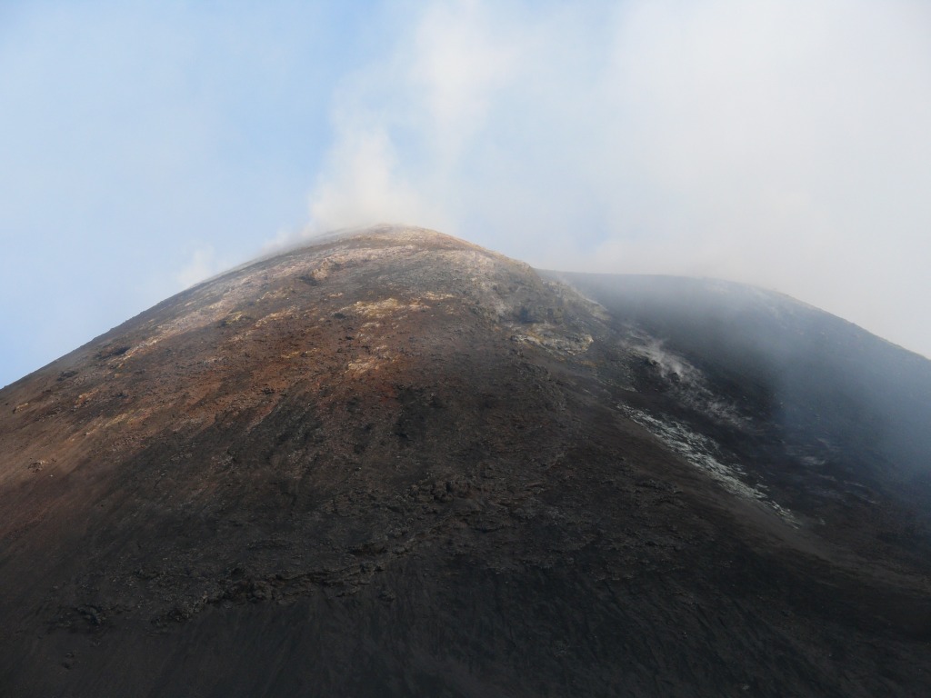 Der Gipfelbereich des Neuen Südostkraters ist teilweise von hellen bis gelblichen Ablagerungen überzogen. Fumarolen am Gipfel setzen ständig Gas frei.