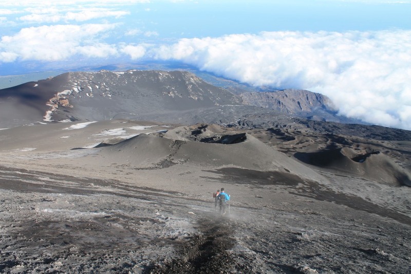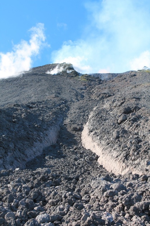 An der Ostflanke des Neuen Südostkraters, unterhalb des Kollapskraters. Blick entlang des Lavakanals, der bis zum 08.12.2015 aktiv war. Im Hintergrund erkennt man den Kollapskrater aus dem anhaltend etwas Gas aufsteigt. Dahinter befindet sich der östlichste Gipfelkrater des Neuen Südostkraters.