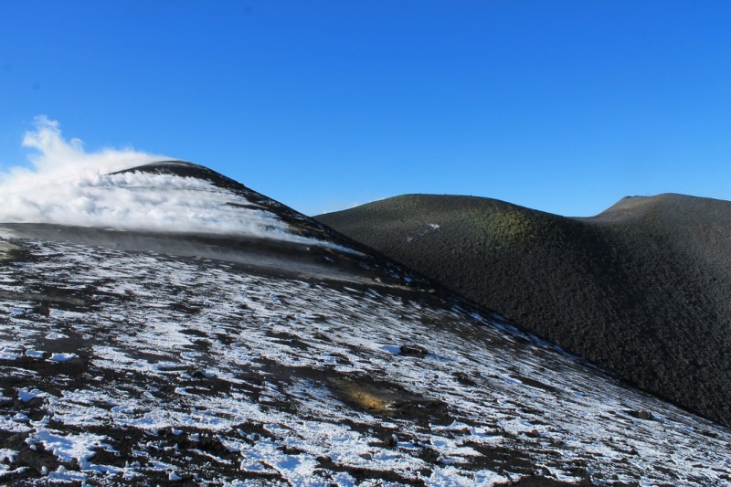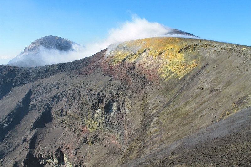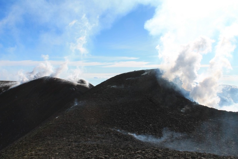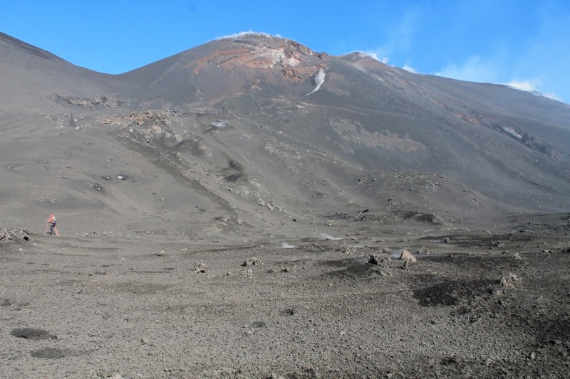 der Südostkraterkomplex. Fumarolen und Spalten setzen im Bereich des Sattels, der den alten Südostkraterkegels (links) mit dem Neuen Südostkraterkegel