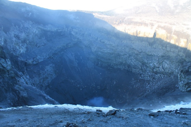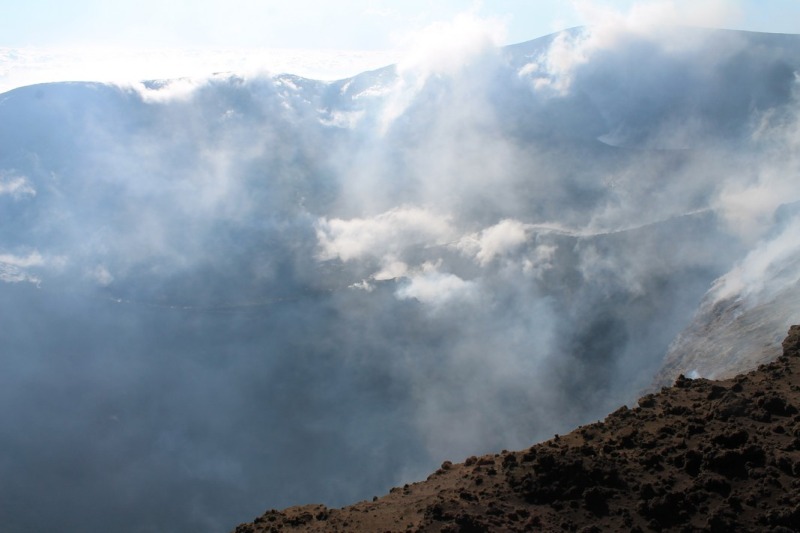 Blick hinab in den Krater des Nordostkraters. Dieser war am Ende der eruptiven Episode des Neuen Südostkraters kurz strombolianisch aktiv und setze anschließend noch einige Tage lang Asche frei. Trotz der Aktivität sind hier die Veränderungen vergleichsweise gering.